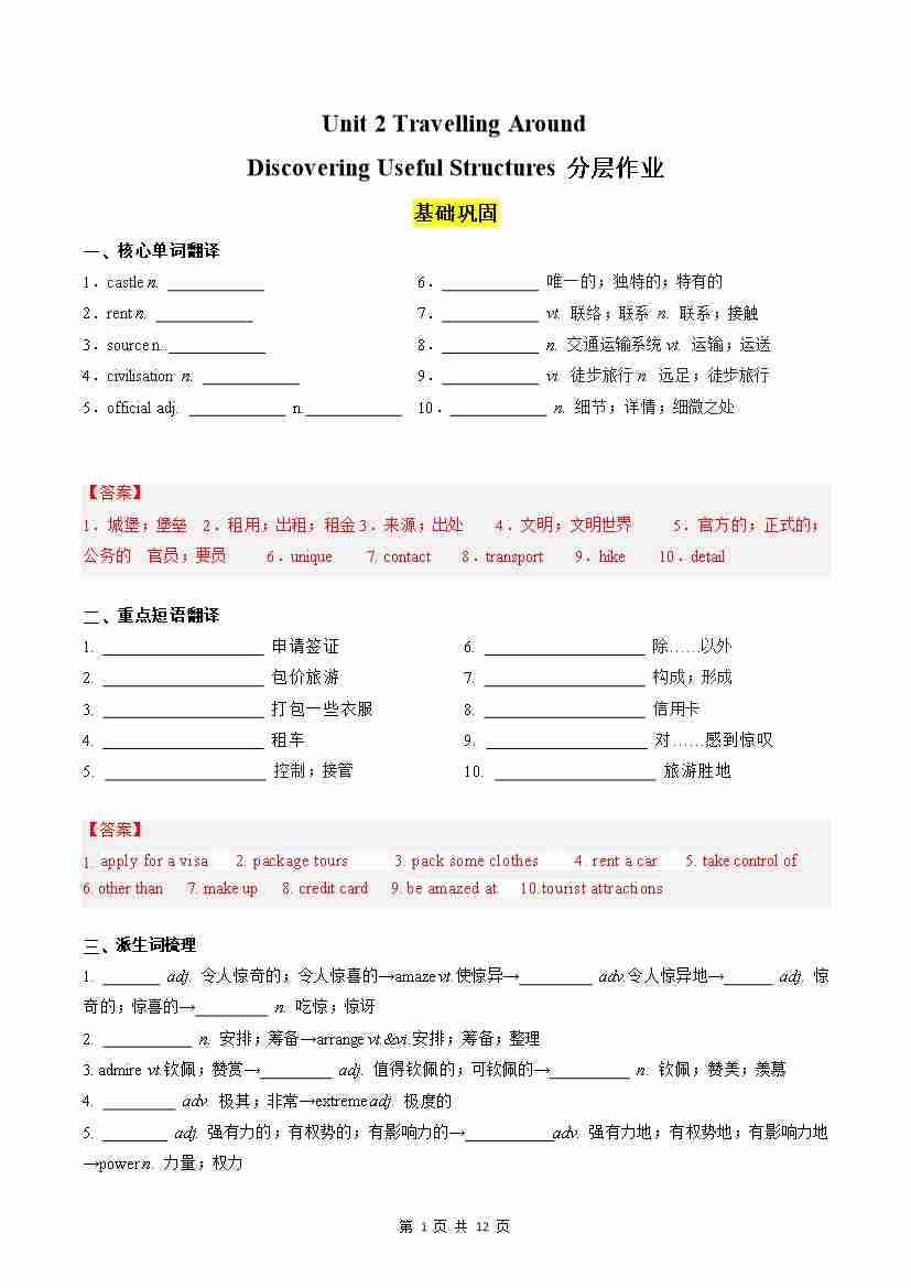 Unit 2 Travelling Around Discovering Useful Structures分层作业(解析版)