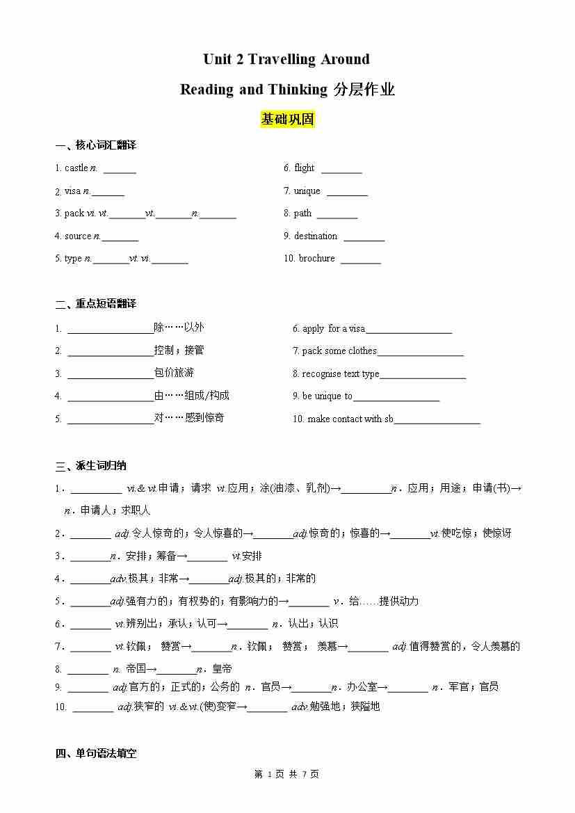 Unit 2 Travelling Around Reading and Thinking分层作业(原卷版)