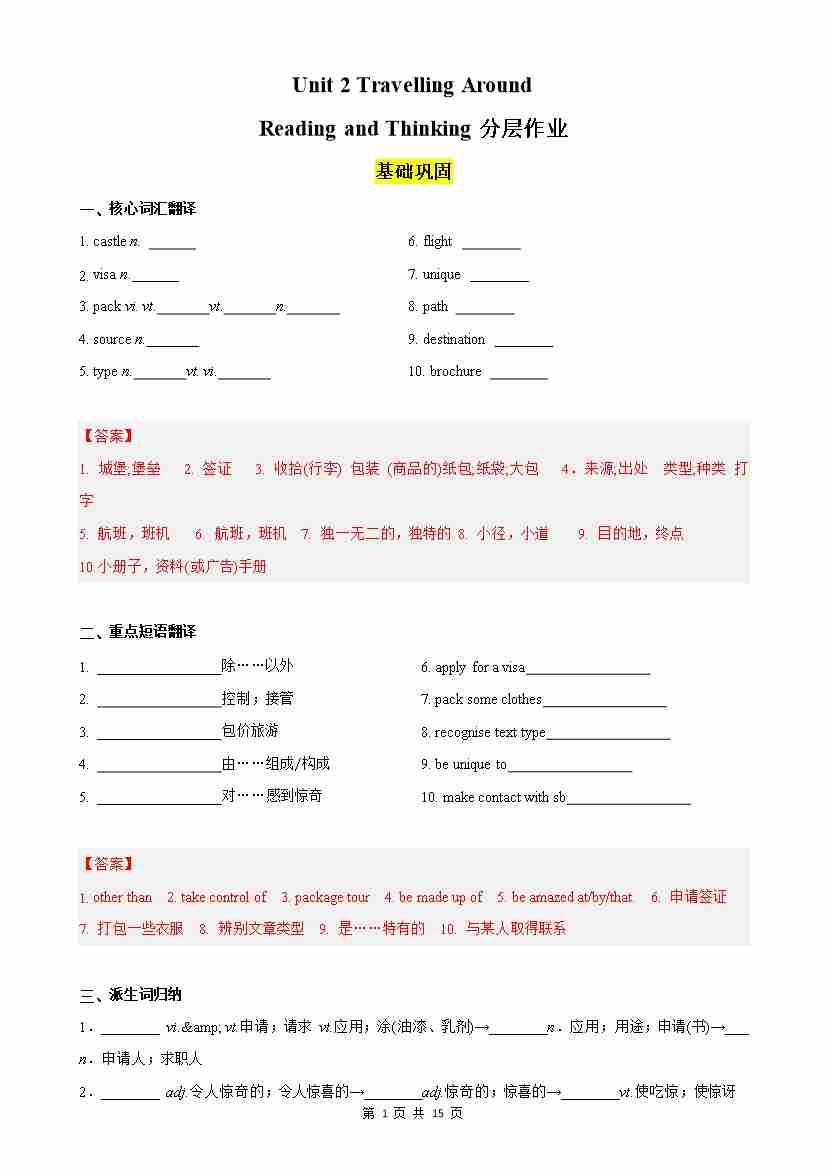 Unit 2 Travelling Around Reading and Thinking分层作业(解析版)