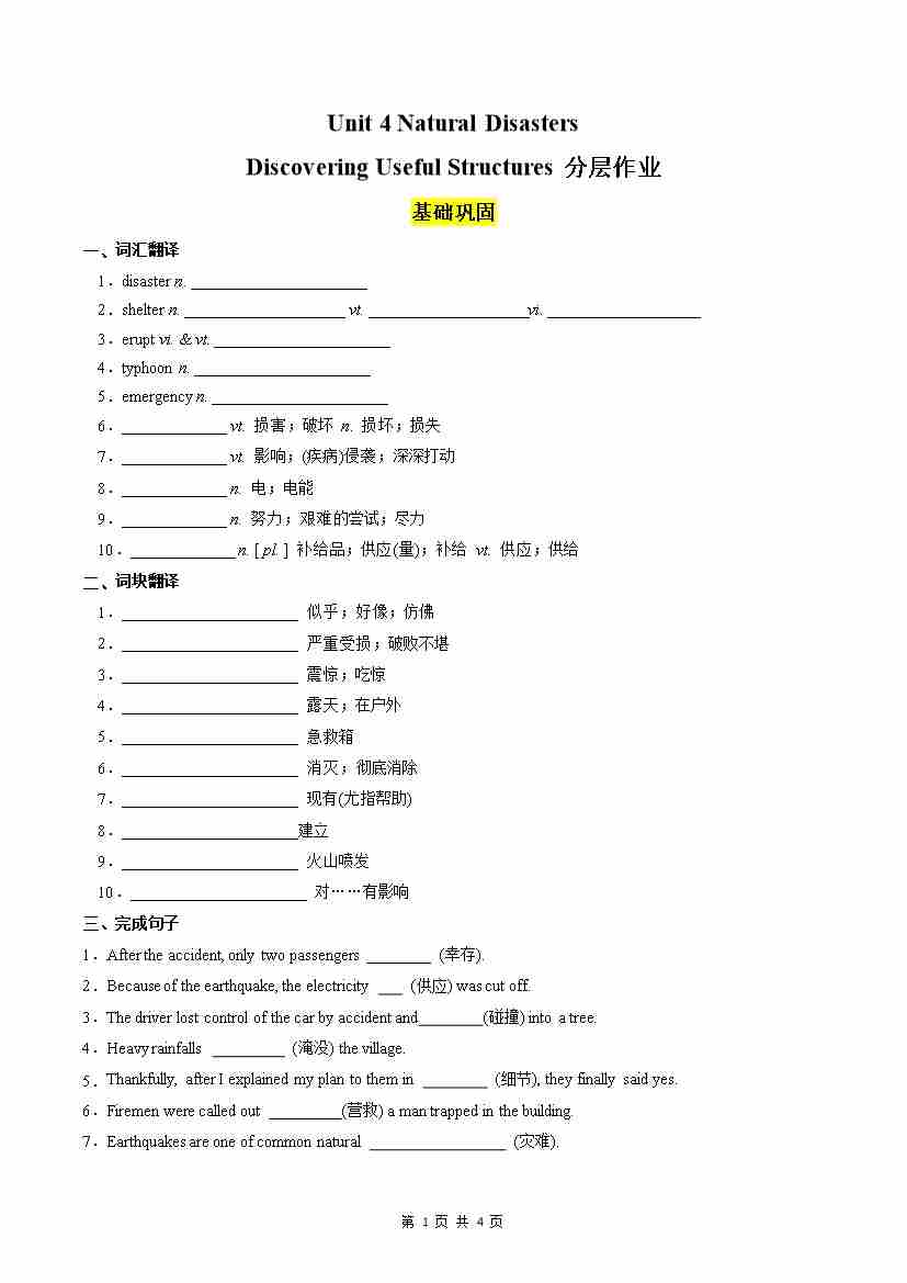 Unit 4 Natural Disasters Discovering Useful Structures分层作业(原卷版)