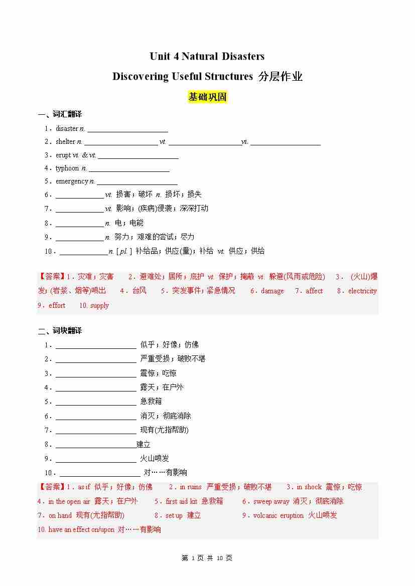 Unit 4 Natural Disasters Discovering Useful Structures分层作业(解析版)