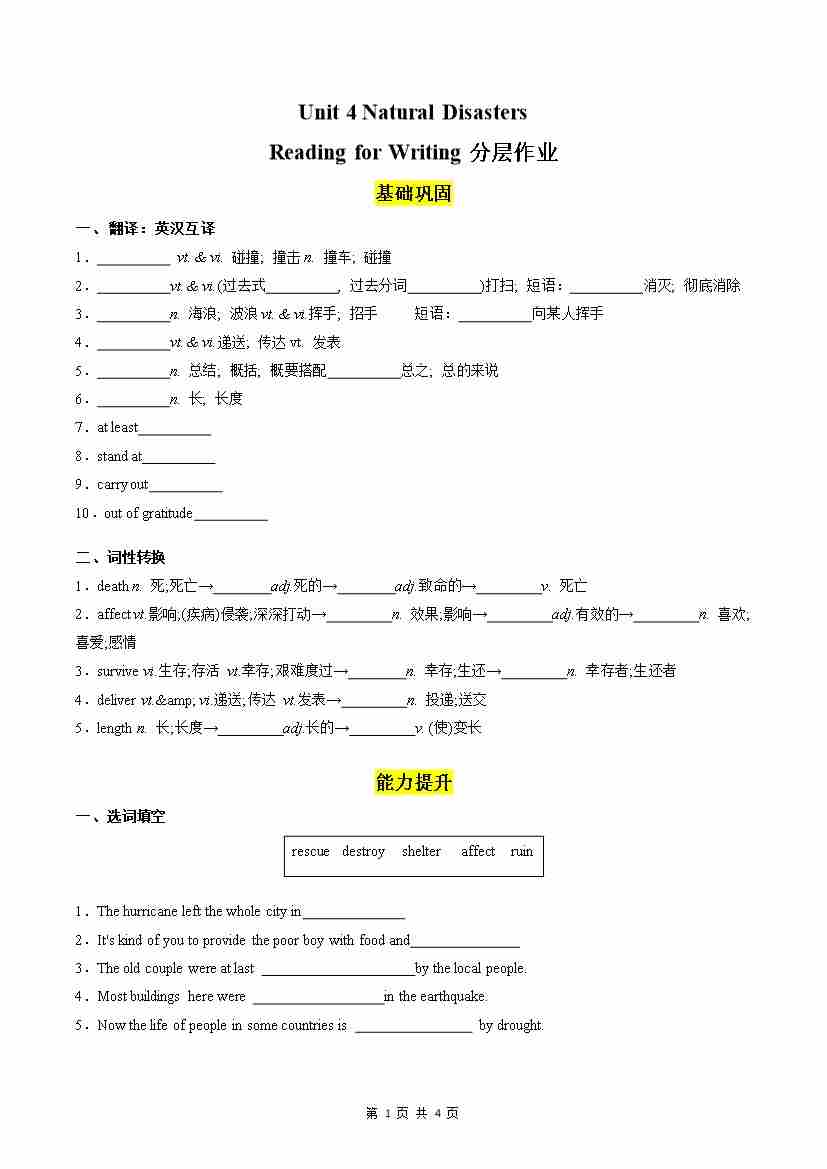 Unit 4 Natural Disasters Reading for Writing分层作业(原卷版)
