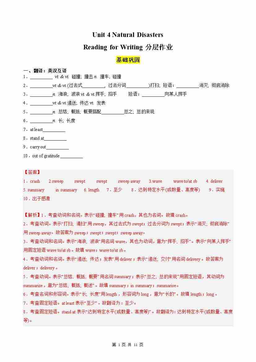 Unit 4 Natural Disasters Reading for Writing分层作业(解析版)