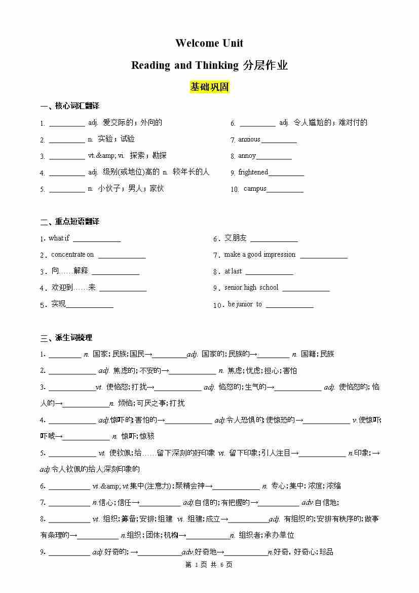 Welcome Unit Reading and Thinking分层作业(原卷版)