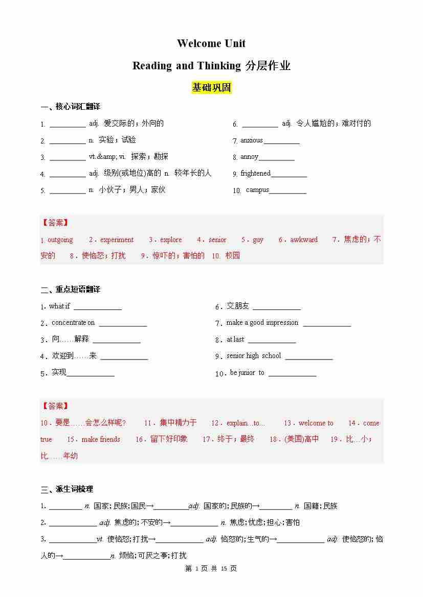 Welcome Unit Reading and Thinking分层作业(解析版)