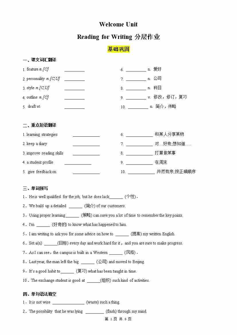 Welcome Unit Reading for Writing分层作业(原卷版)