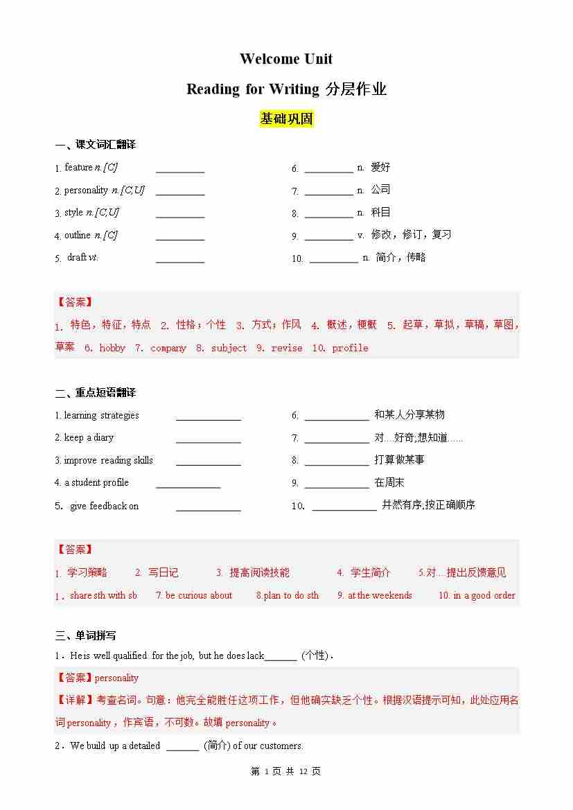 Welcome Unit Reading for Writing分层作业(解析版)