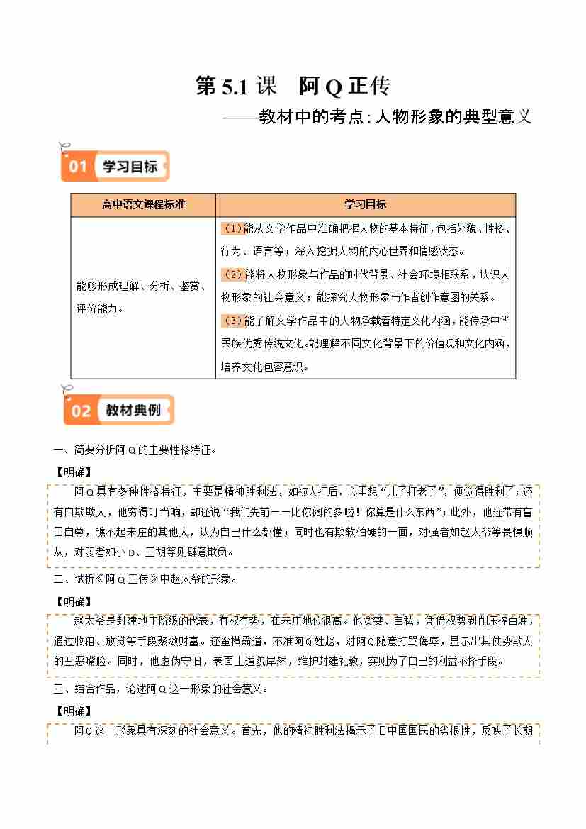 第5.1课 阿Q正传(教材中的考点:人物形象的典型意义)(学生版)