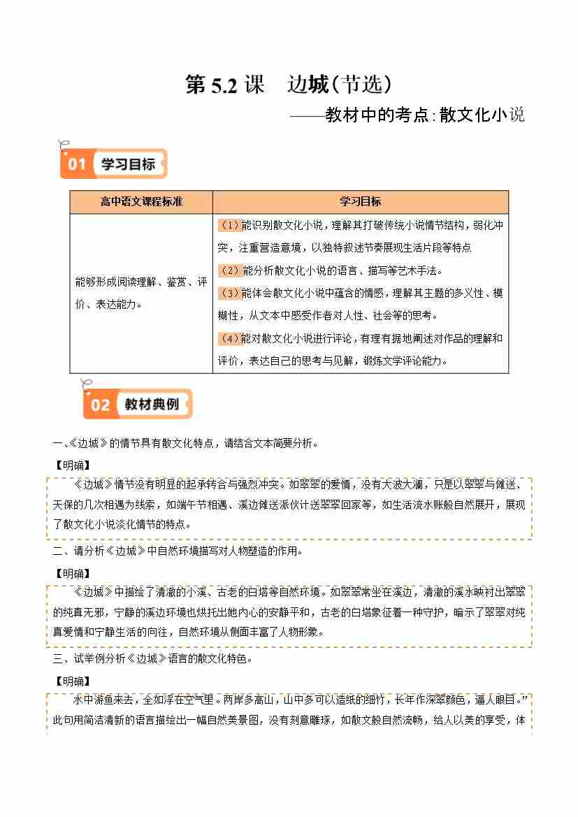 第5.2课 边城(节选)(教材中的考点:散文化小说)(学生版)