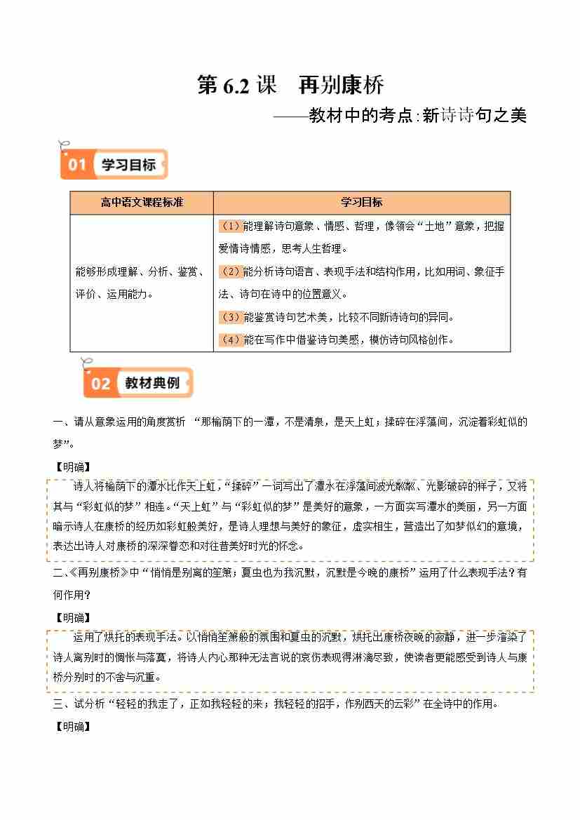 第6.2课 再别康桥(教材中的考点:诗句之美)(学生版)