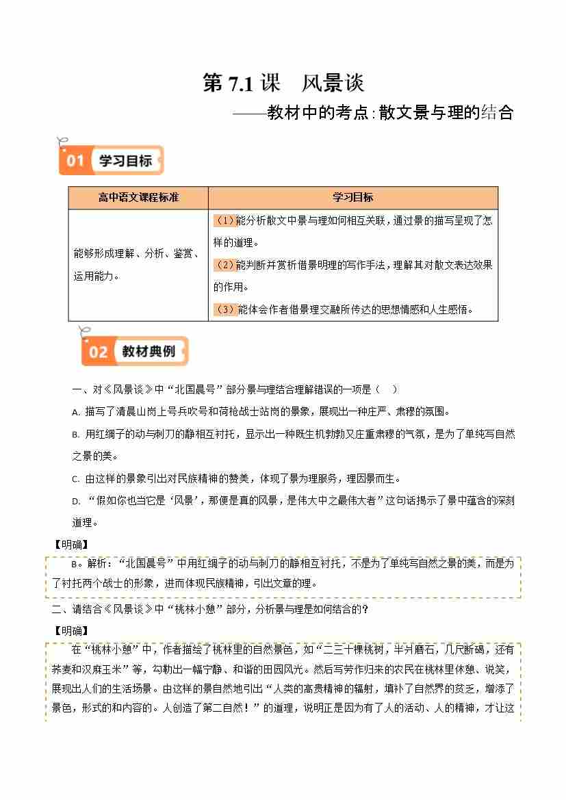 第7.1课 风景谈(教材中的考点:散文景与理的结合)(学生版)
