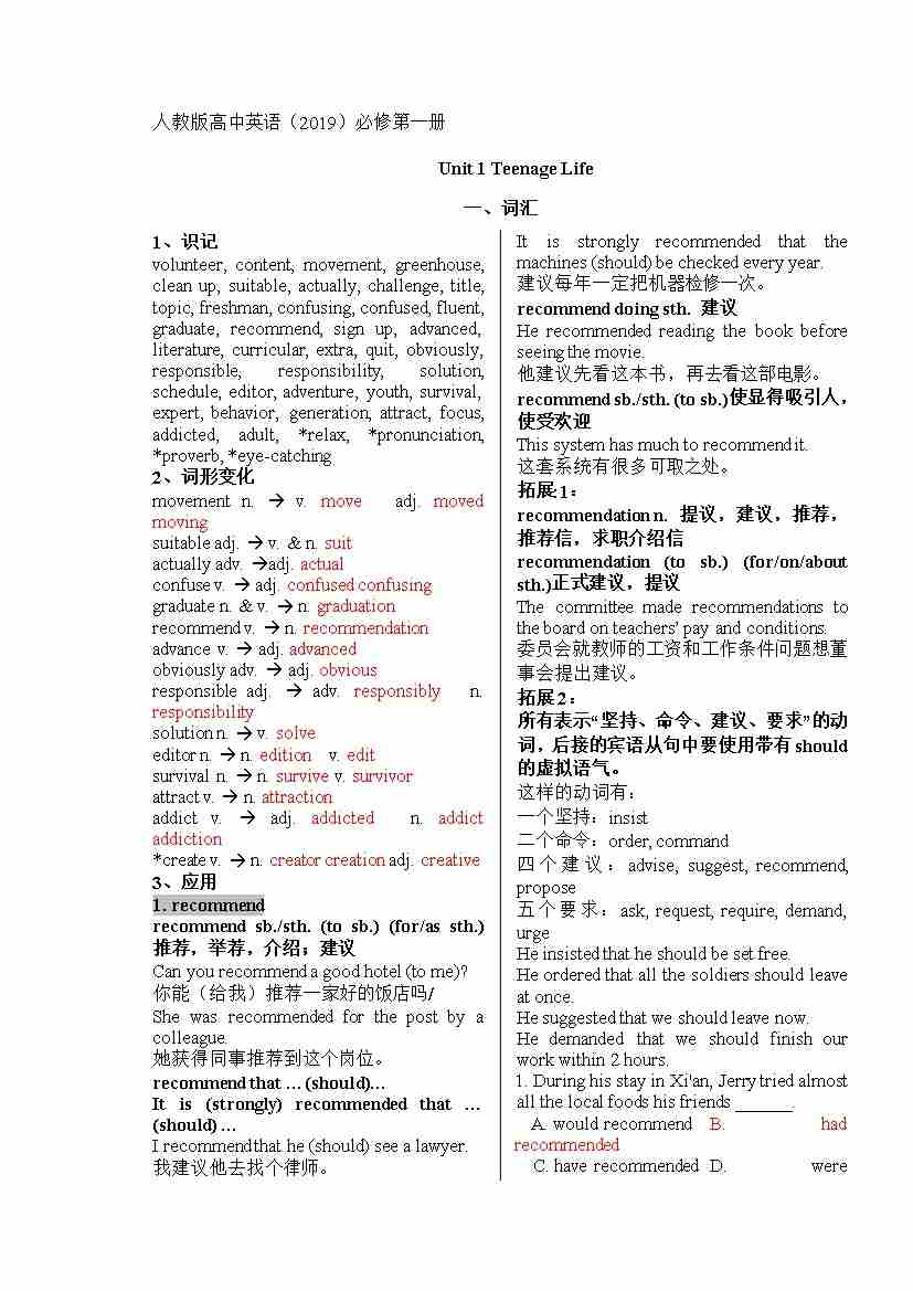 Unit 1 Teenage life 教案(含词汇,阅读,语法,写作)【新教材】