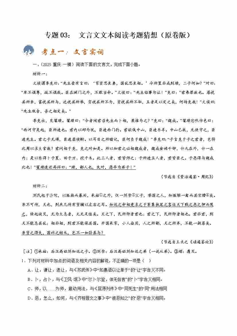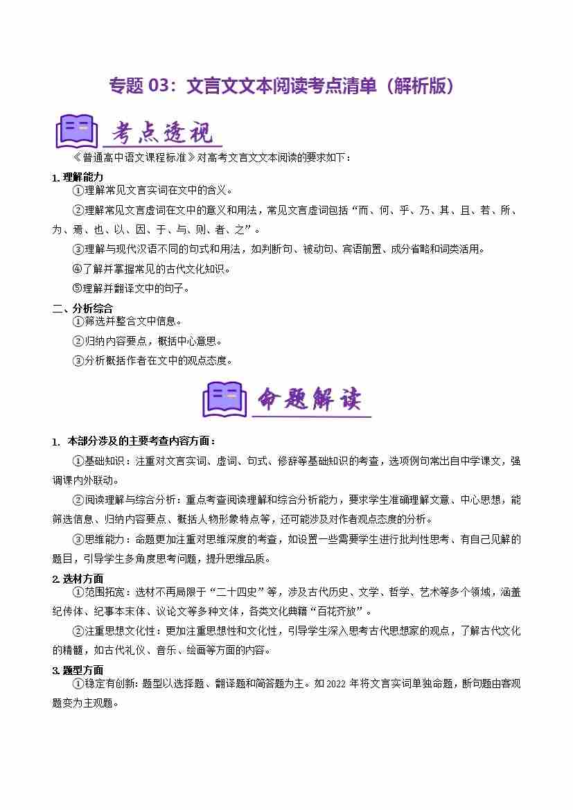 专题03: 文言文文本阅读(考题猜想)(学生版)