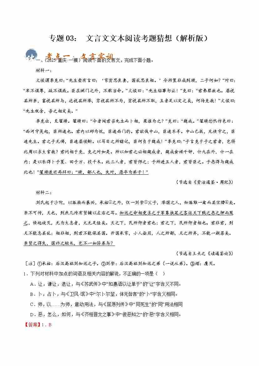 专题03: 文言文文本阅读(考题猜想)(教师版)