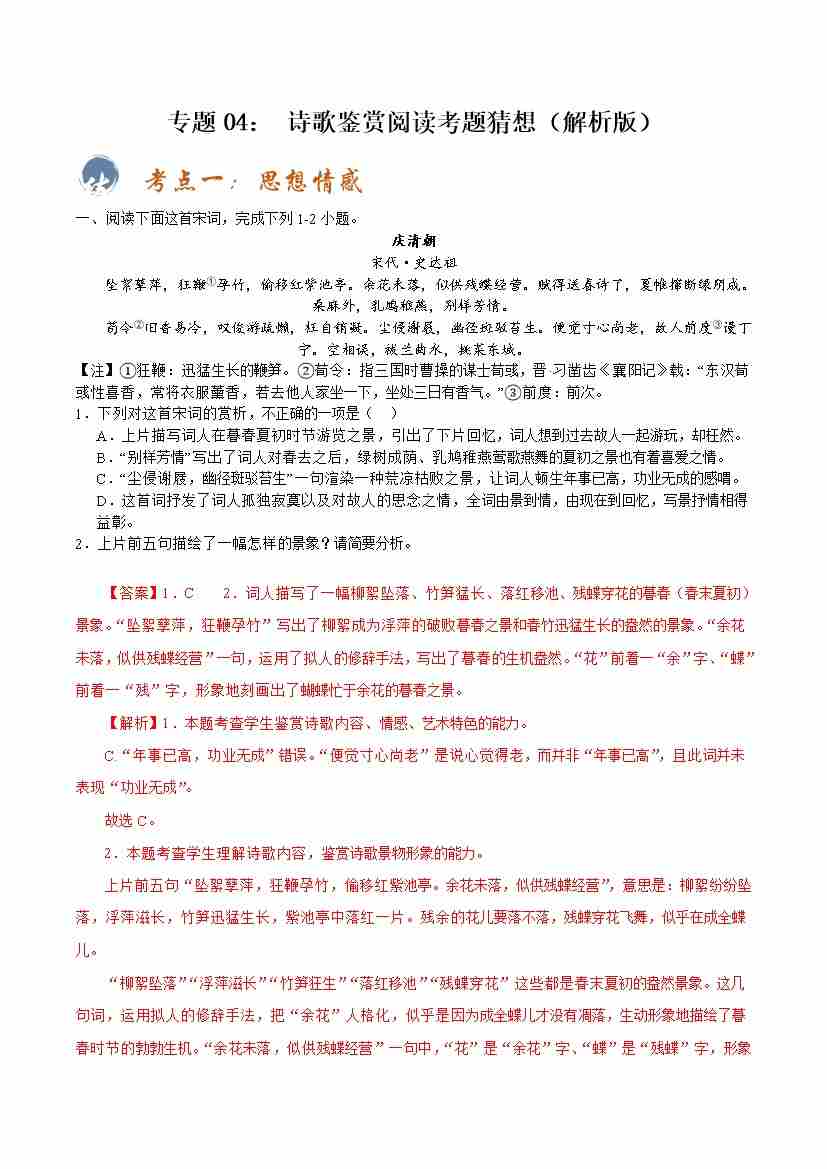 专题04:诗歌鉴赏阅读(考题猜想)(教师版)