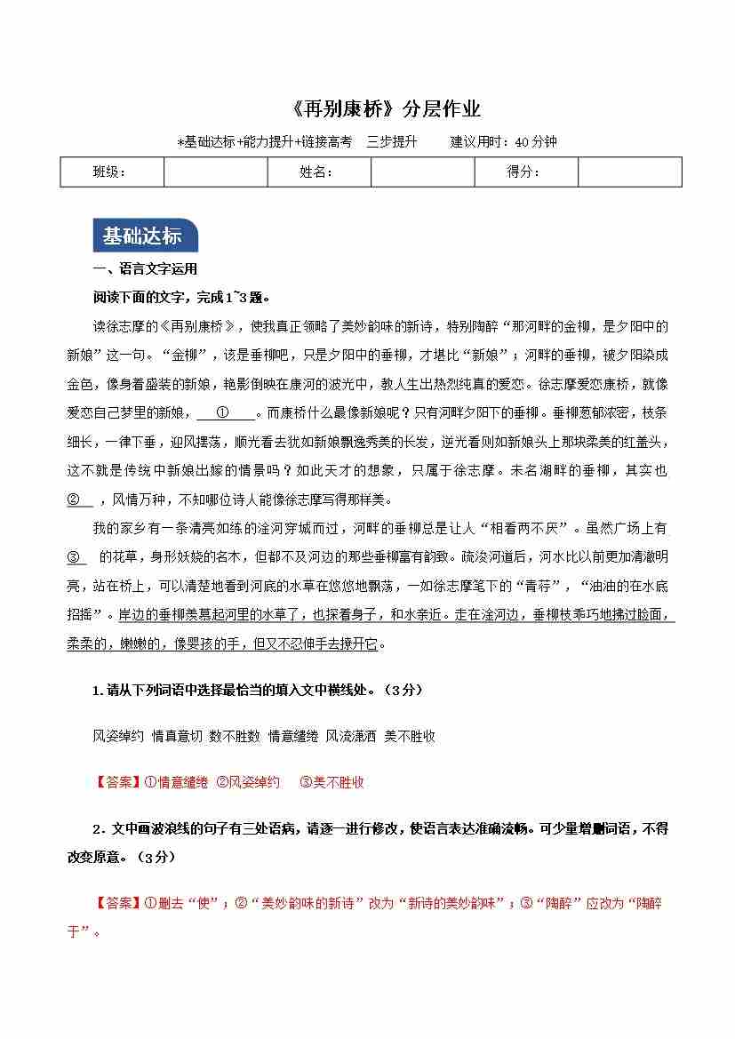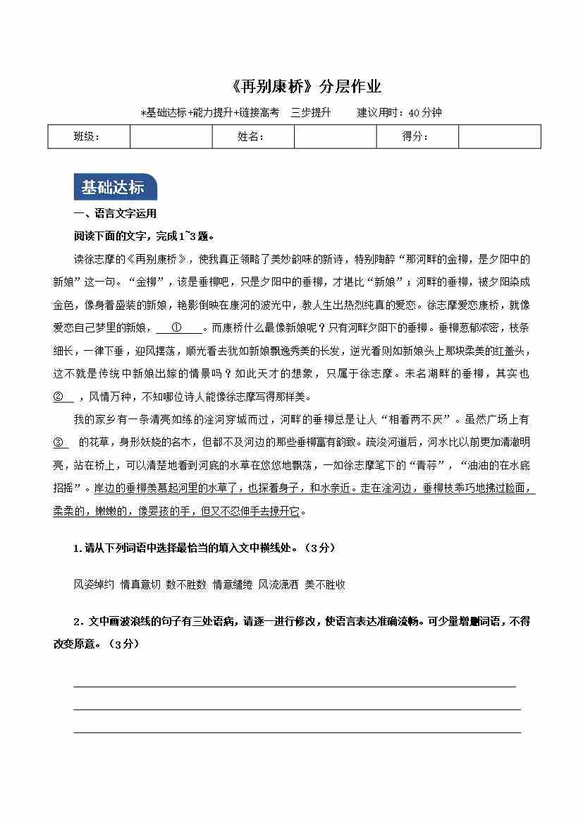 《再别康桥》(分层作业)(原卷版)-(统编版 选择性必修下册)