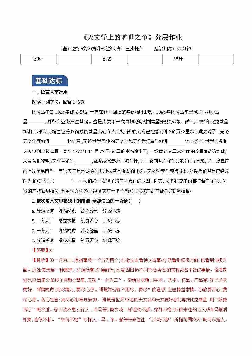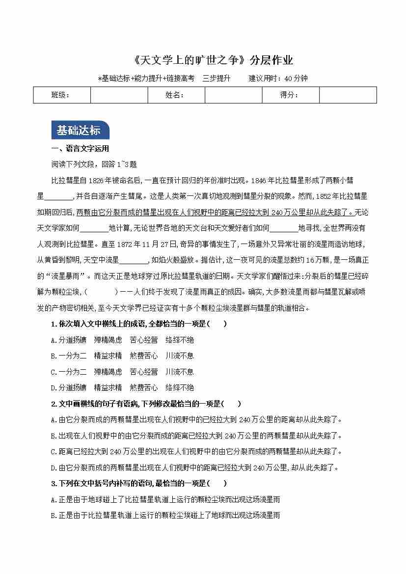 《天文学上的旷世之争》(分层作业)(原卷版)