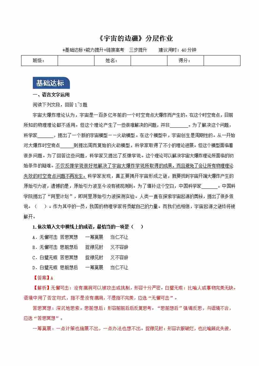 《宇宙的边疆》(分层作业)(解析版)