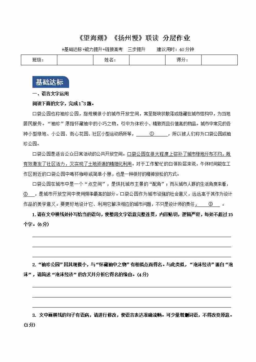 《望海潮》《扬州慢》联读(分层作业)(解析版)