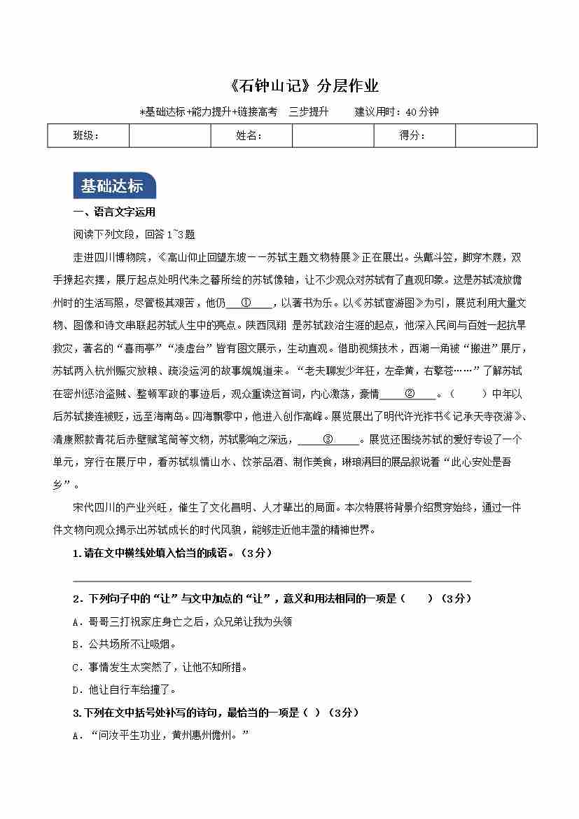 《石钟山记》(分层作业)(原卷版)-(统编版 选择性必修下册)