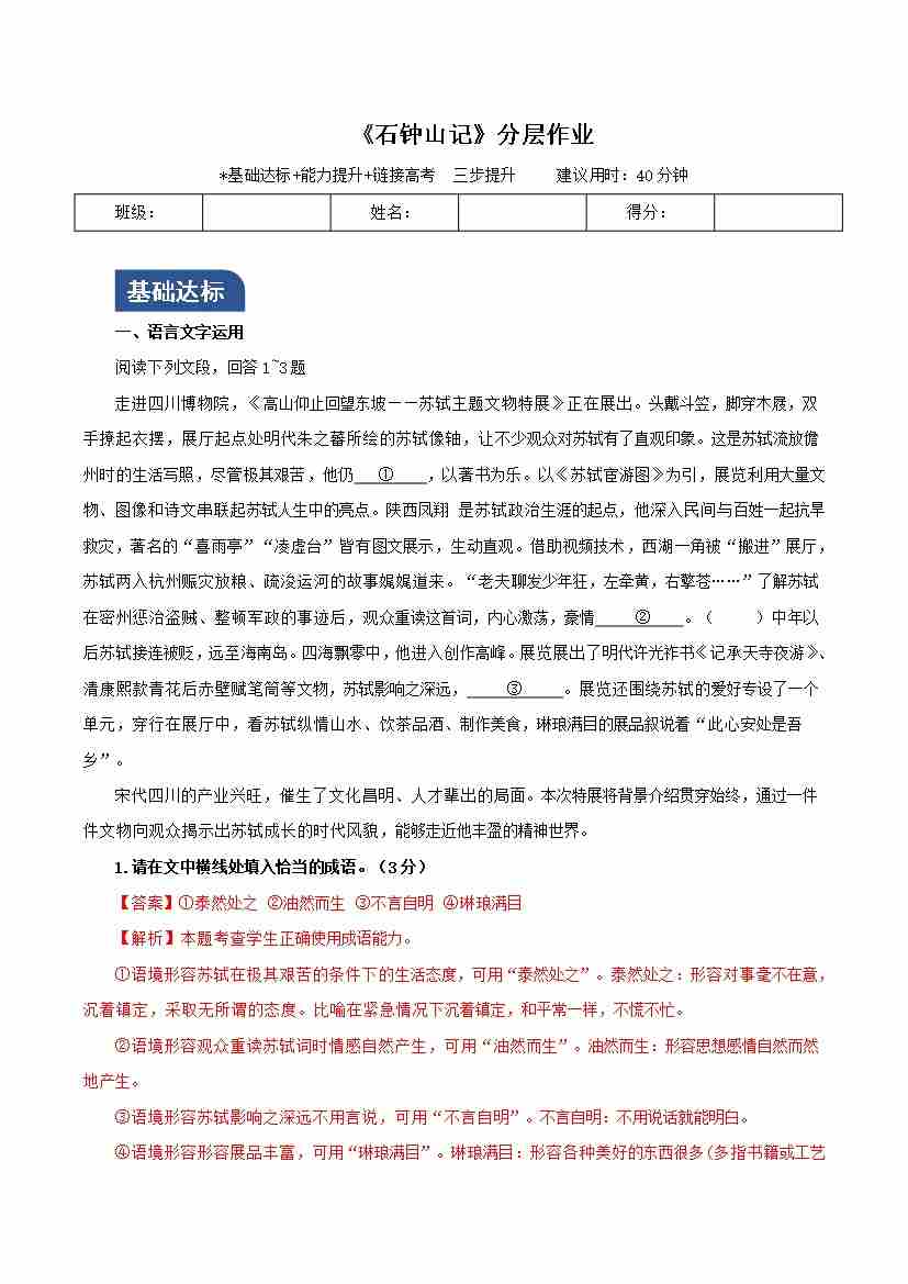 《石钟山记》(分层作业)(解析版)-(统编版 选择性必修下册)