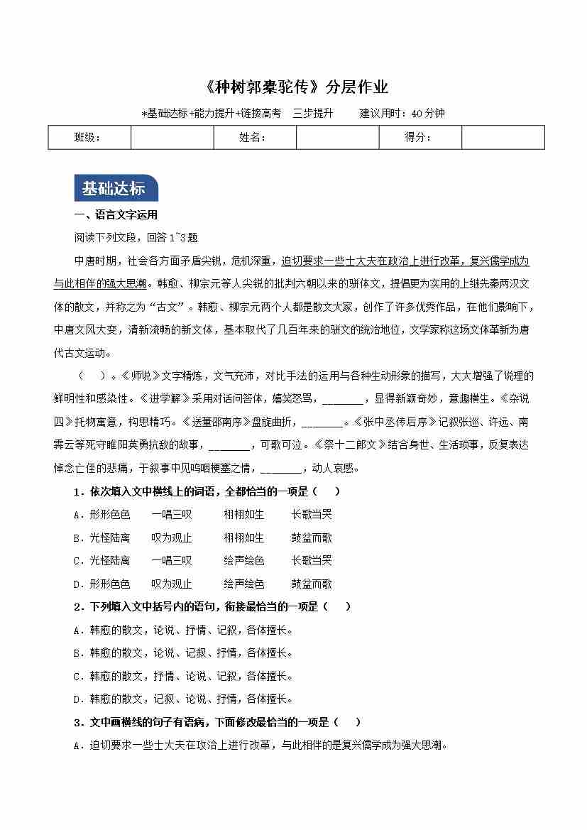 《种树郭橐驼传》(分层作业)(原卷版)