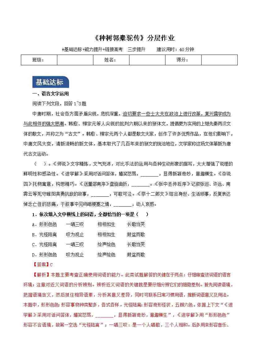 《种树郭橐驼传》(分层作业)(解析版)