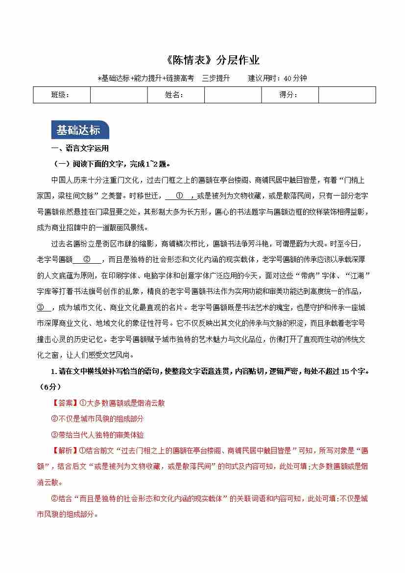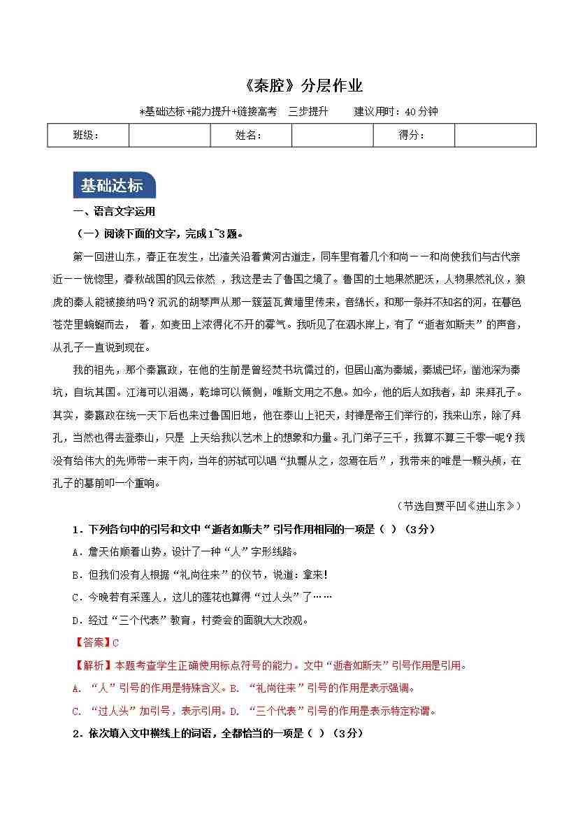 《秦腔》(分层作业)(解析版)