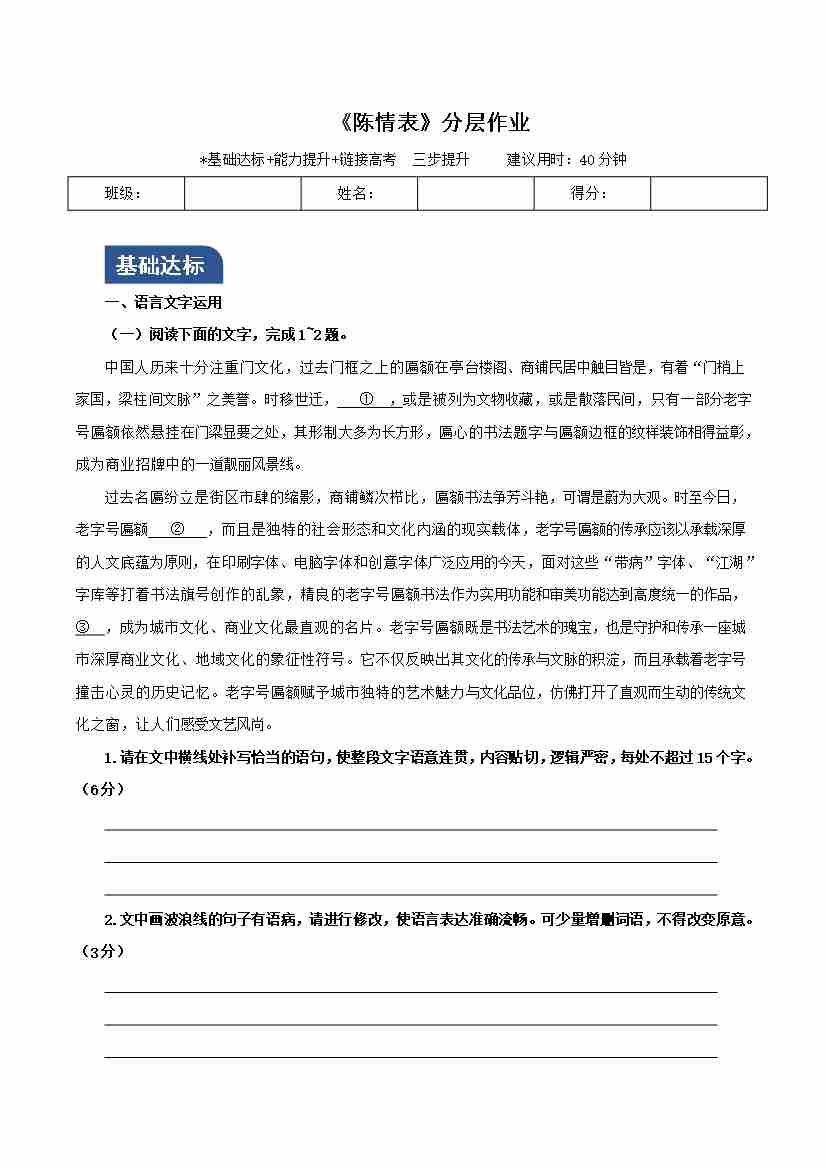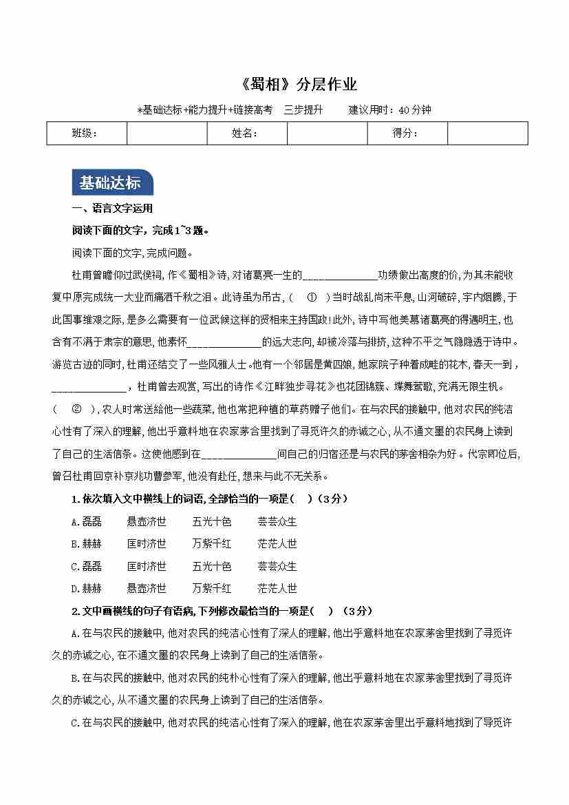 《蜀相》(分层作业)(原卷版)-(统编版 选择性必修下册)