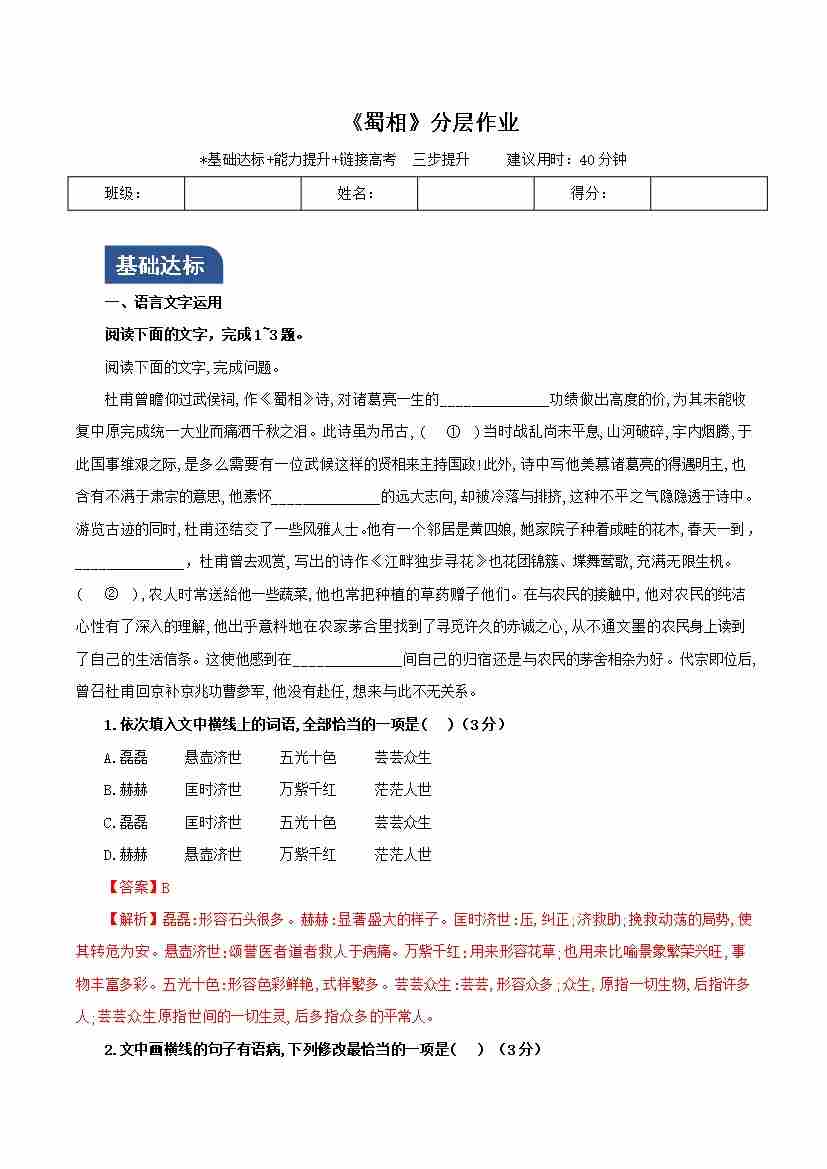 《蜀相》(分层作业)(解析版)-(统编版 选择性必修下册)