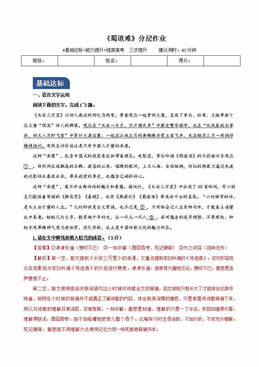 《蜀道难》(分层作业)(解析版)
