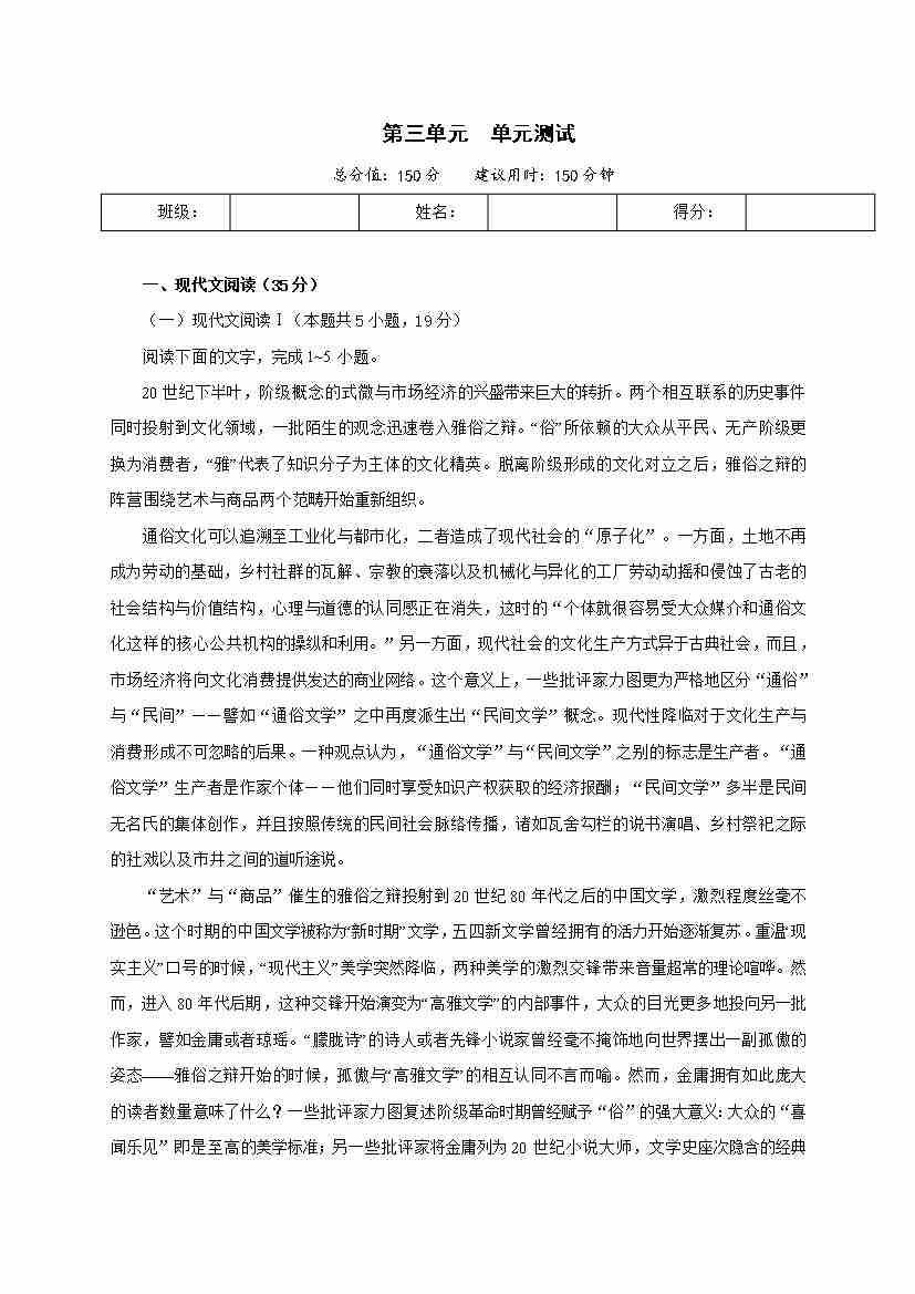 高中语文选择必修下册第三单元(单元测试)(原卷版)