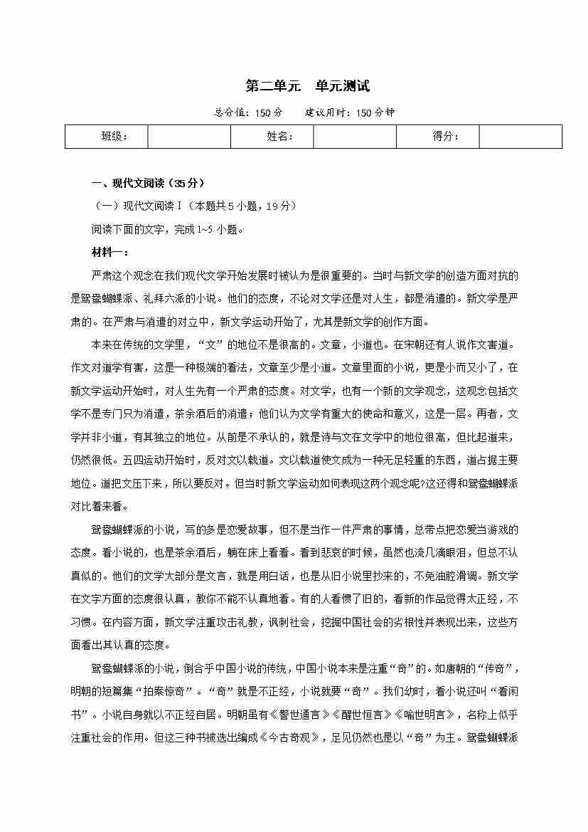 高中语文选择必修下册第二单元(单元测试)(原卷版)
