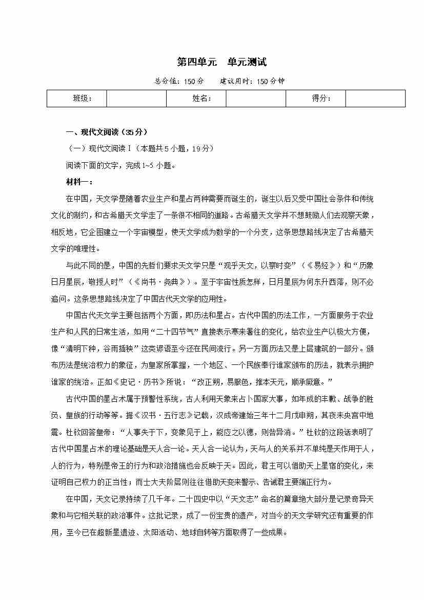 高中语文选择必修下册第四单元(单元测试)(原卷版)