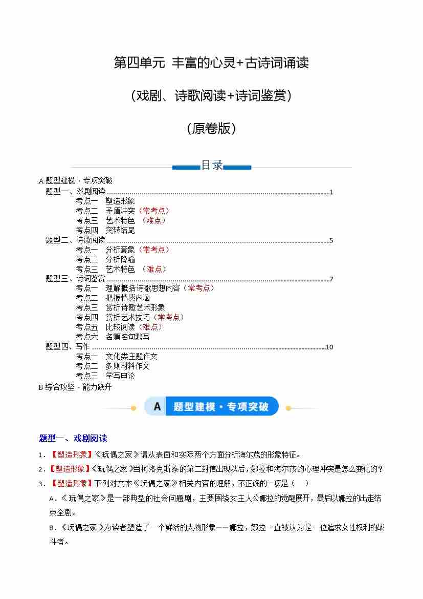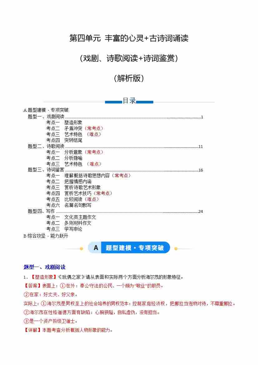 第四单元 丰富的心灵(含古诗词诵读)(专项训练)(教师版)