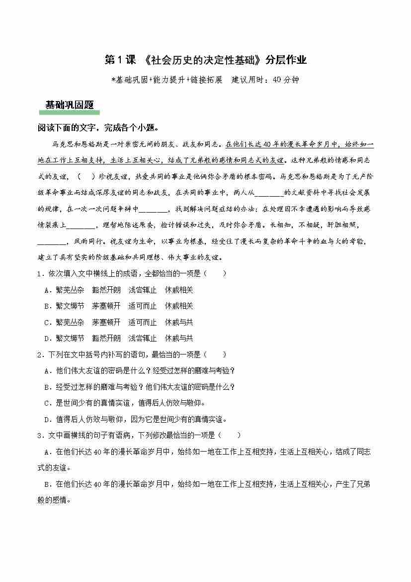 1 《社会历史的决定性基础》(主题任务式分层作业解析版)