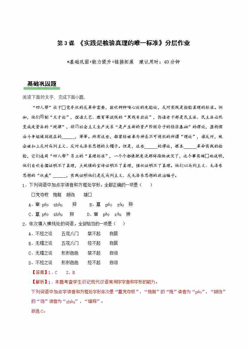 3 《实践是检验真理的唯一标准》(分层作业)(解析版)