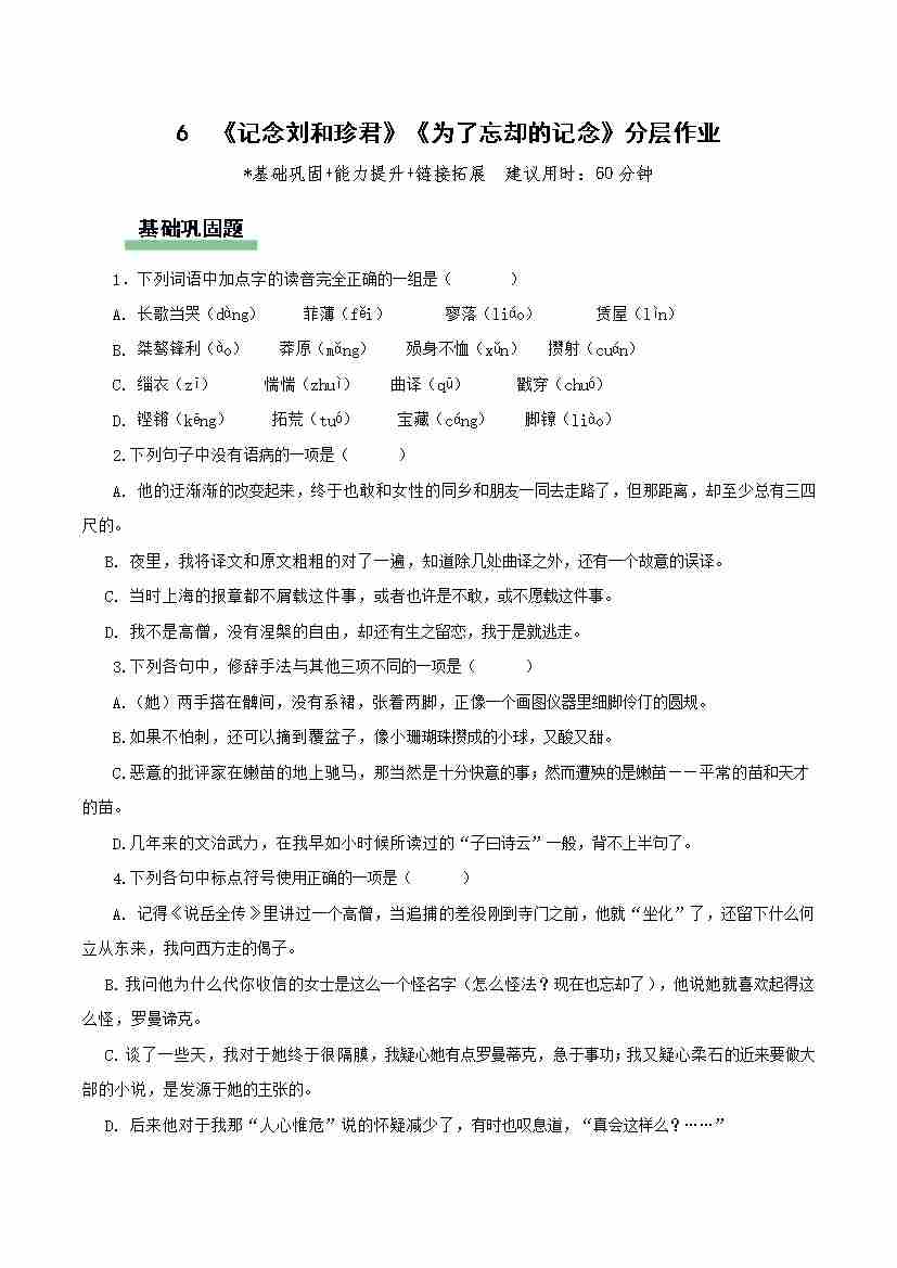 6《记念刘和珍君》《为了忘却的纪念》(分层作业)(原卷版)