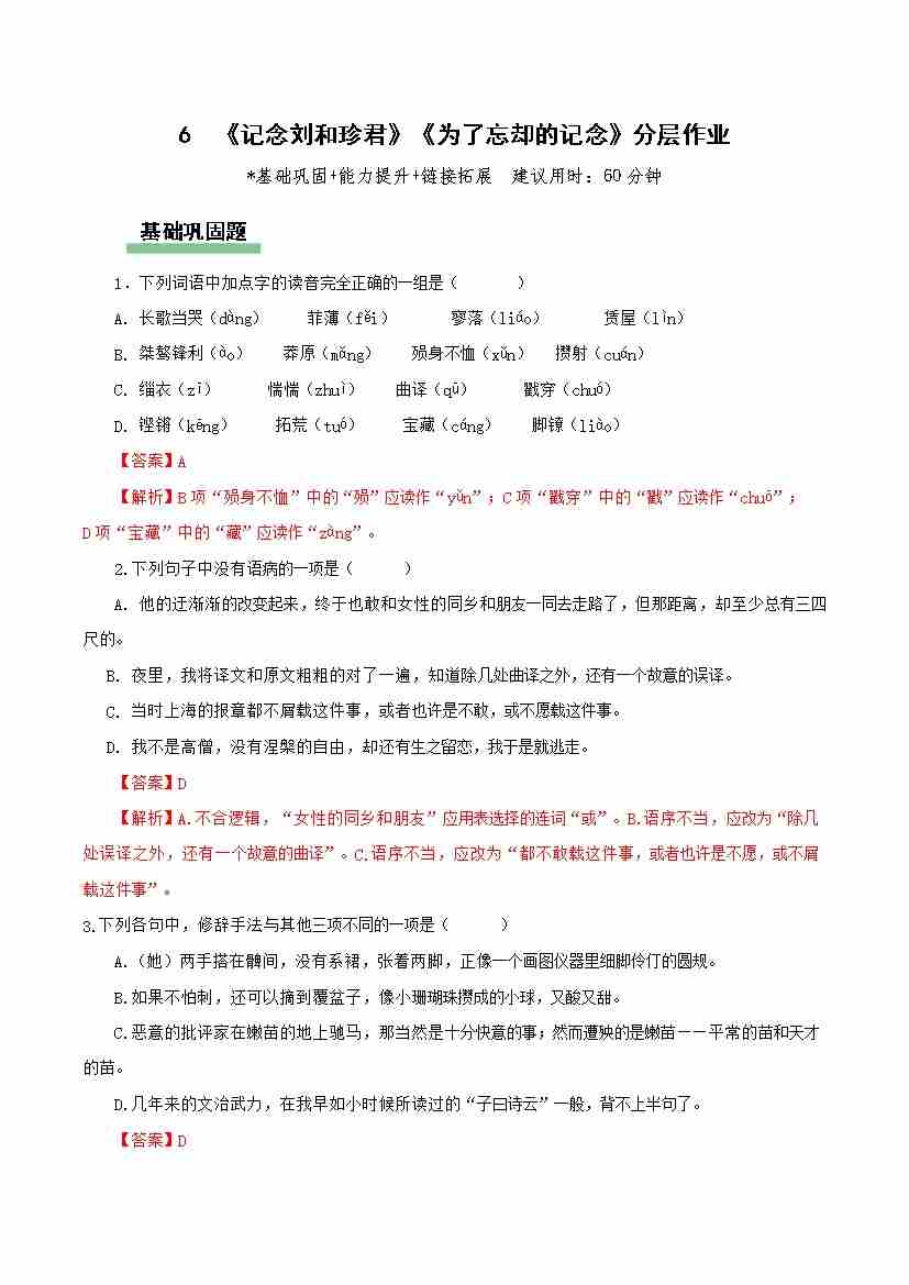 6《记念刘和珍君》《为了忘却的纪念》(分层作业)(解析版)