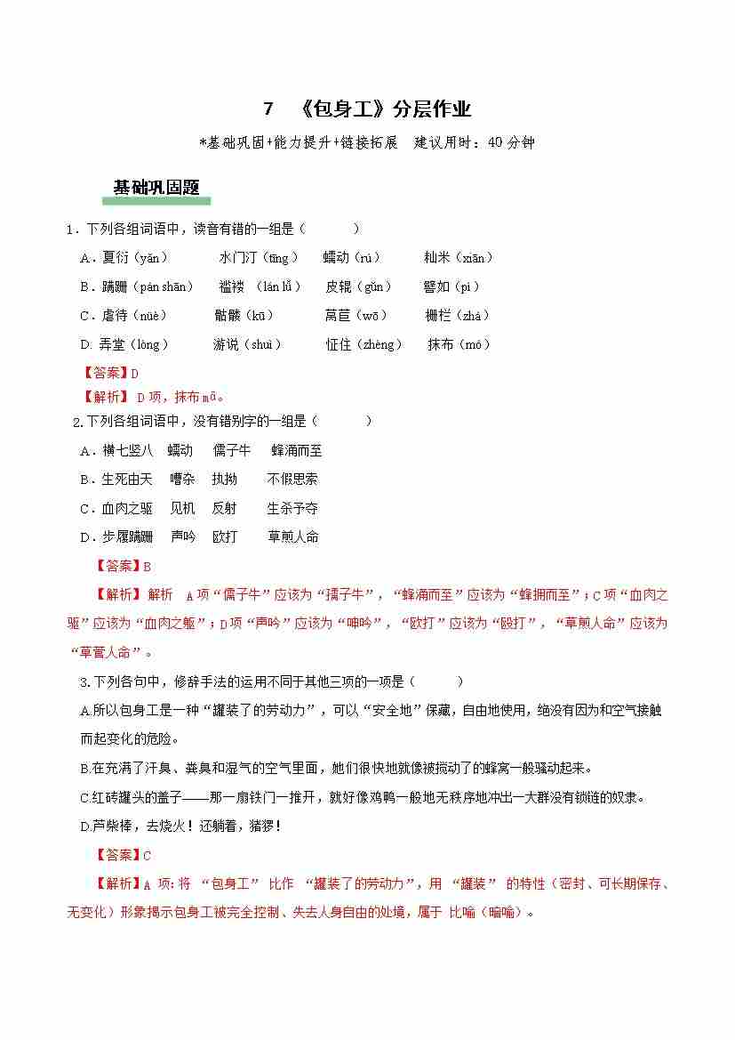 7《包身工》(分层作业)(解析版)
