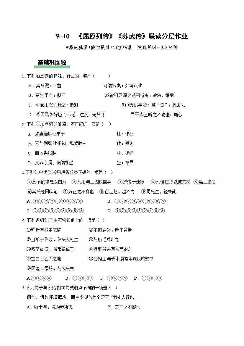 9-10《屈原列传》《苏武传》联读(分层作业)(原卷版)