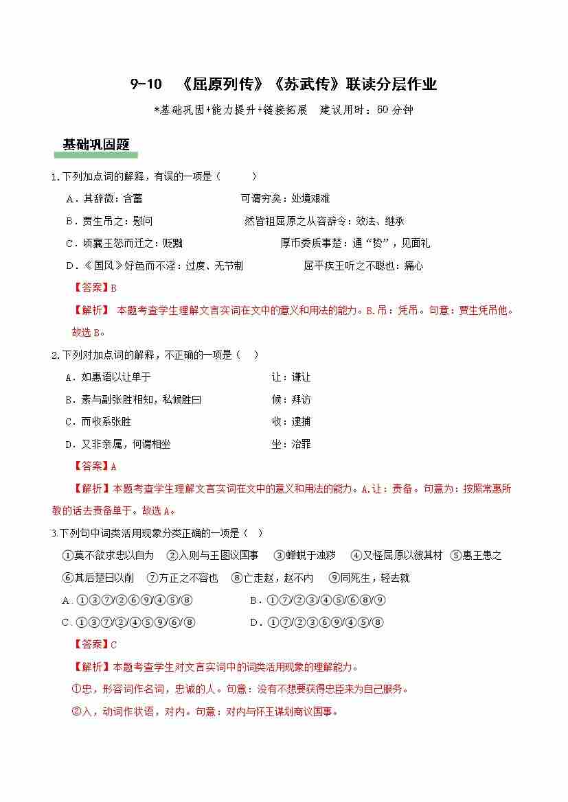 9-10《屈原列传》《苏武传》联读(分层作业)(解析版)