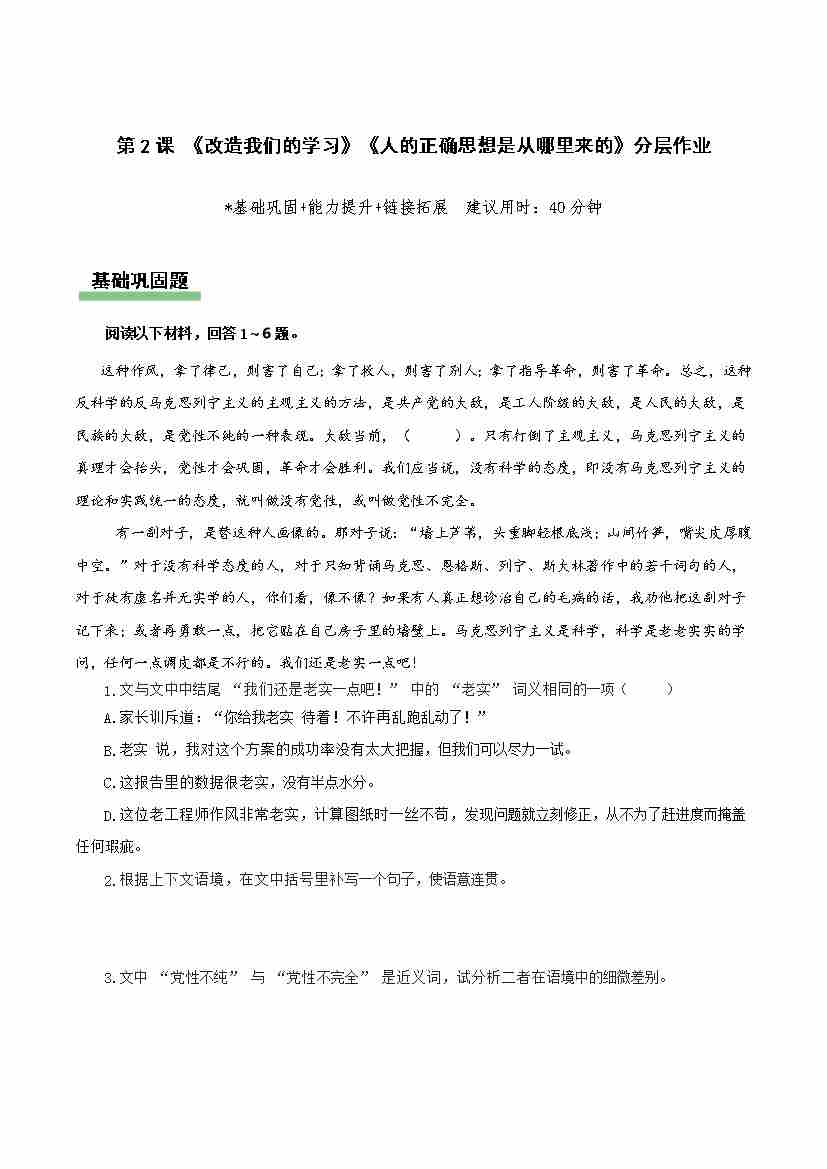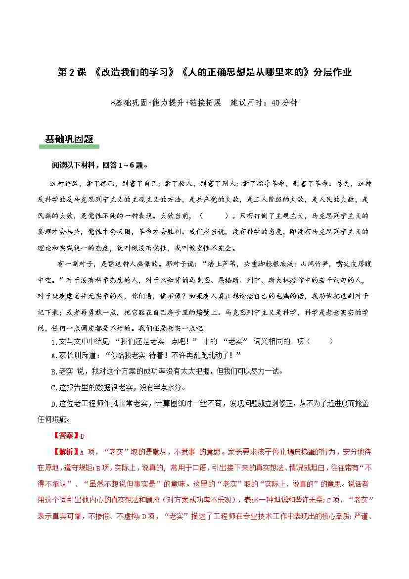 第2课《改造我们的学习》《人的正确思想是从哪里来的》(分层作业)(原卷版1)