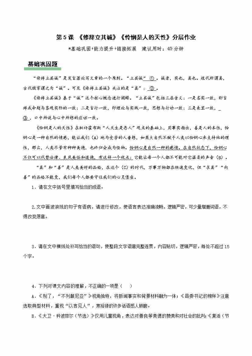 第4课《修辞立其诚》《怜悯是人的天性》(分层作业)(原卷版)