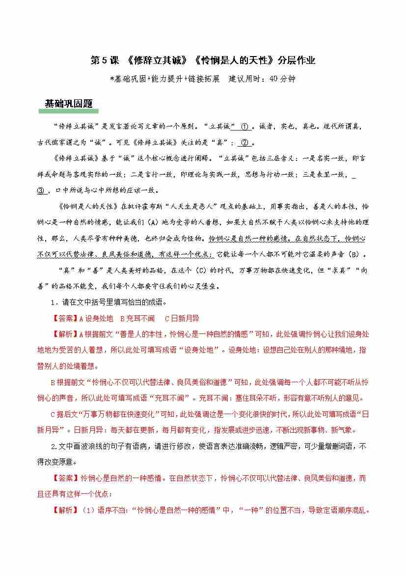 第4课《修辞立其诚》《怜悯是人的天性》(分层作业)(解析版)