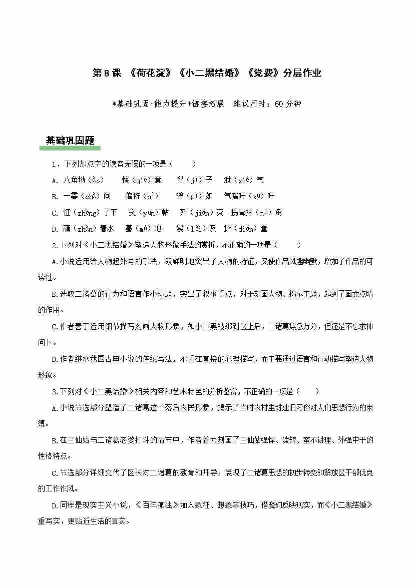 第8课《荷花淀》《小二黑结婚》《党费》(分层作业)(原卷版)