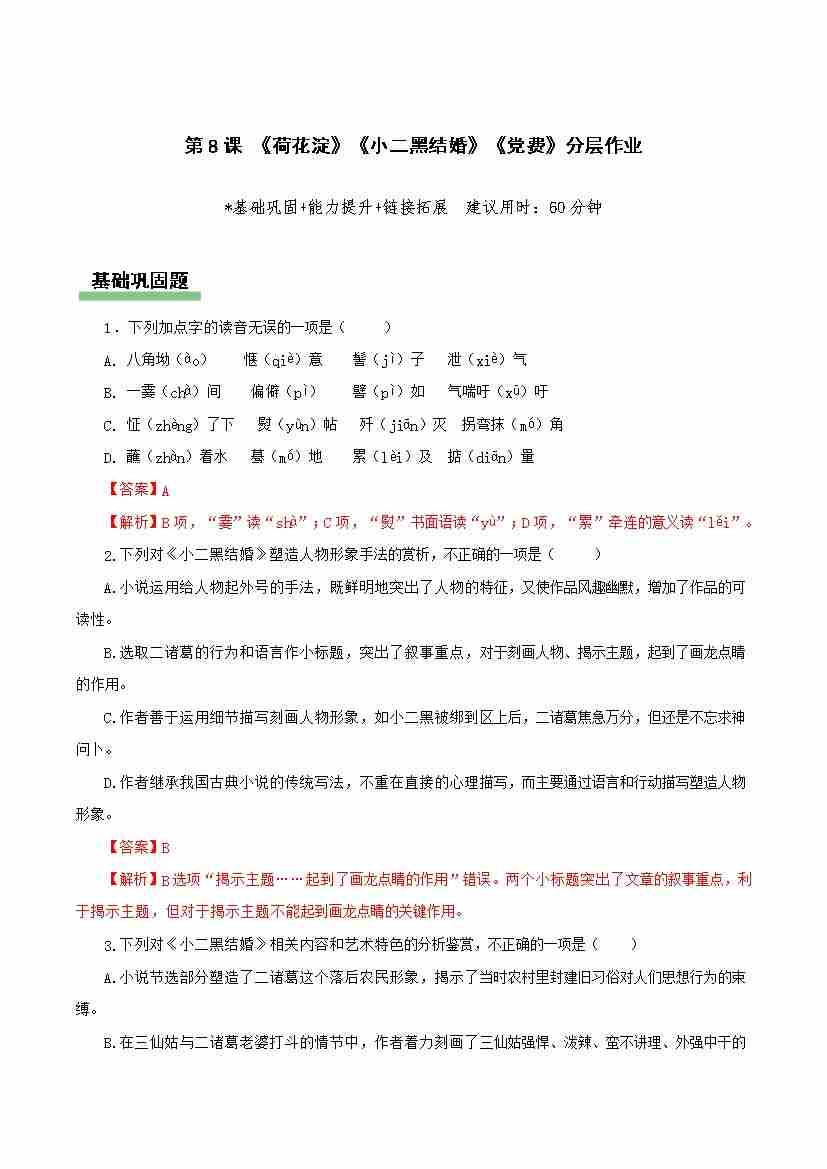 第8课《荷花淀》《小二黑结婚》《党费》(分层作业)(解析版)