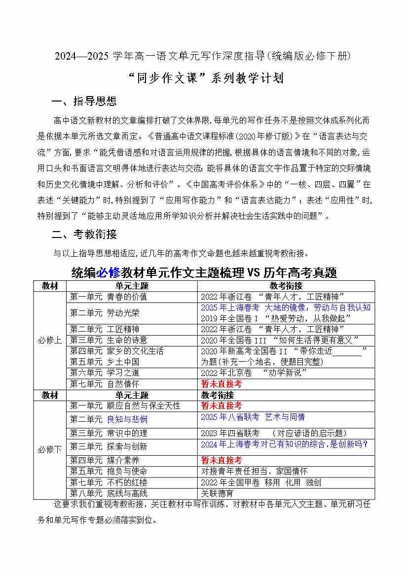 高一语文下学期单元写作深度指导教学计划-(统编版必修下册)