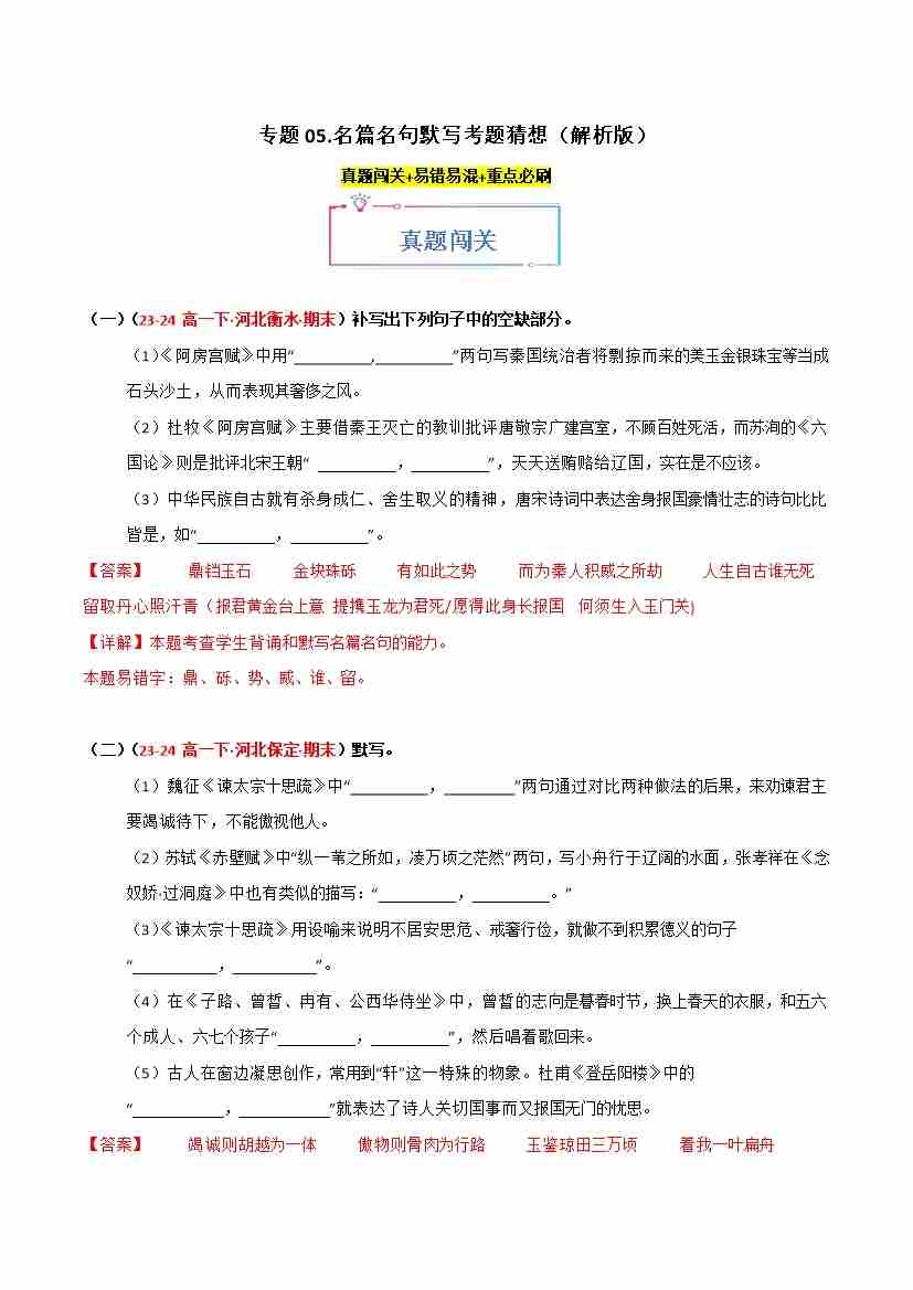 专题05 名篇名句默写(考题猜想)(教师版)1