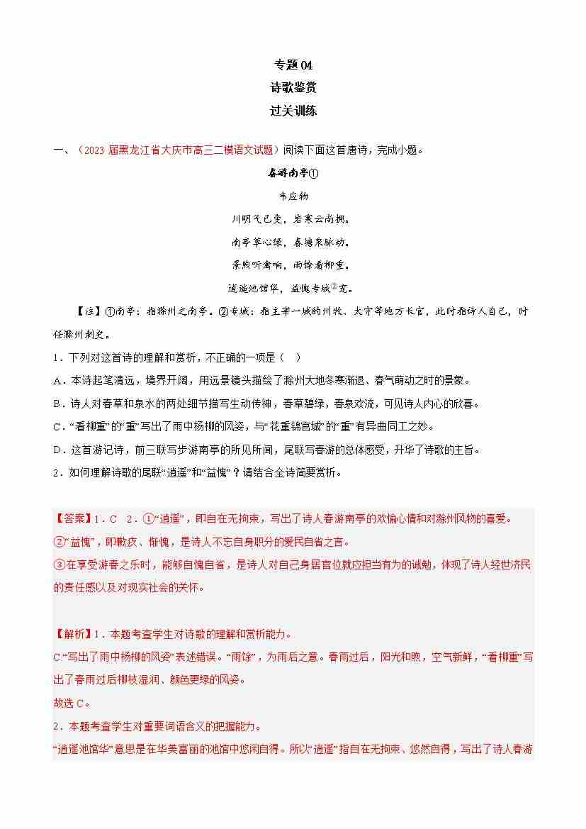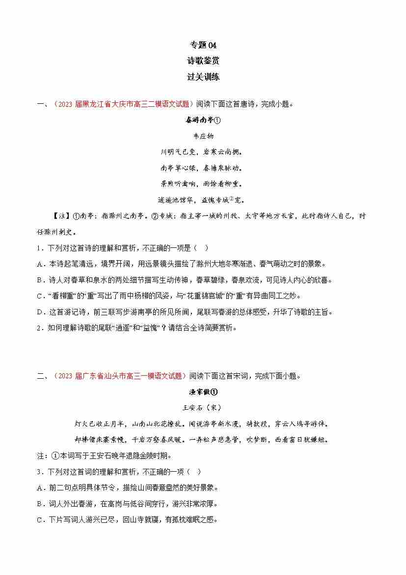 期中专题04 诗歌鉴赏(过关训练)-高一语文下学期期中期(统编版必修下册)学生版